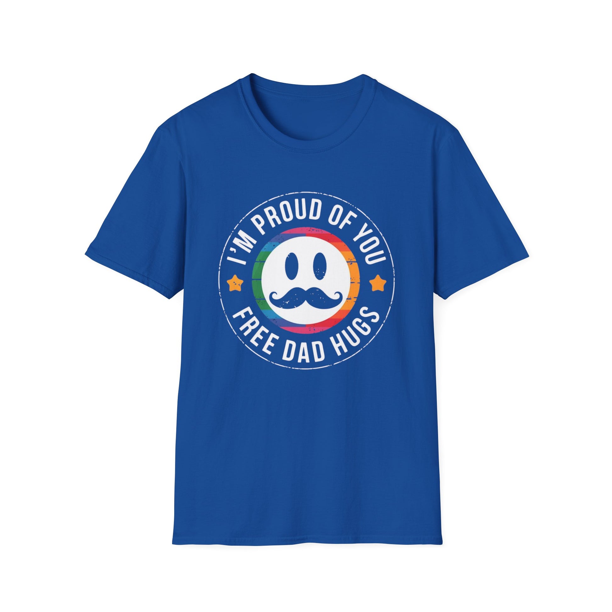 This shirt doesn’t just hug you—it sees you. Featuring a vintage-style rainbow badge with a mustached smiley face and the message “I’m Proud of You / Free Dad Hugs,” this unisex tee is made for every father figure, ally, or chosen family member who shows up when it matters most. It’s not just a shirt. It’s a hug in wearable form.