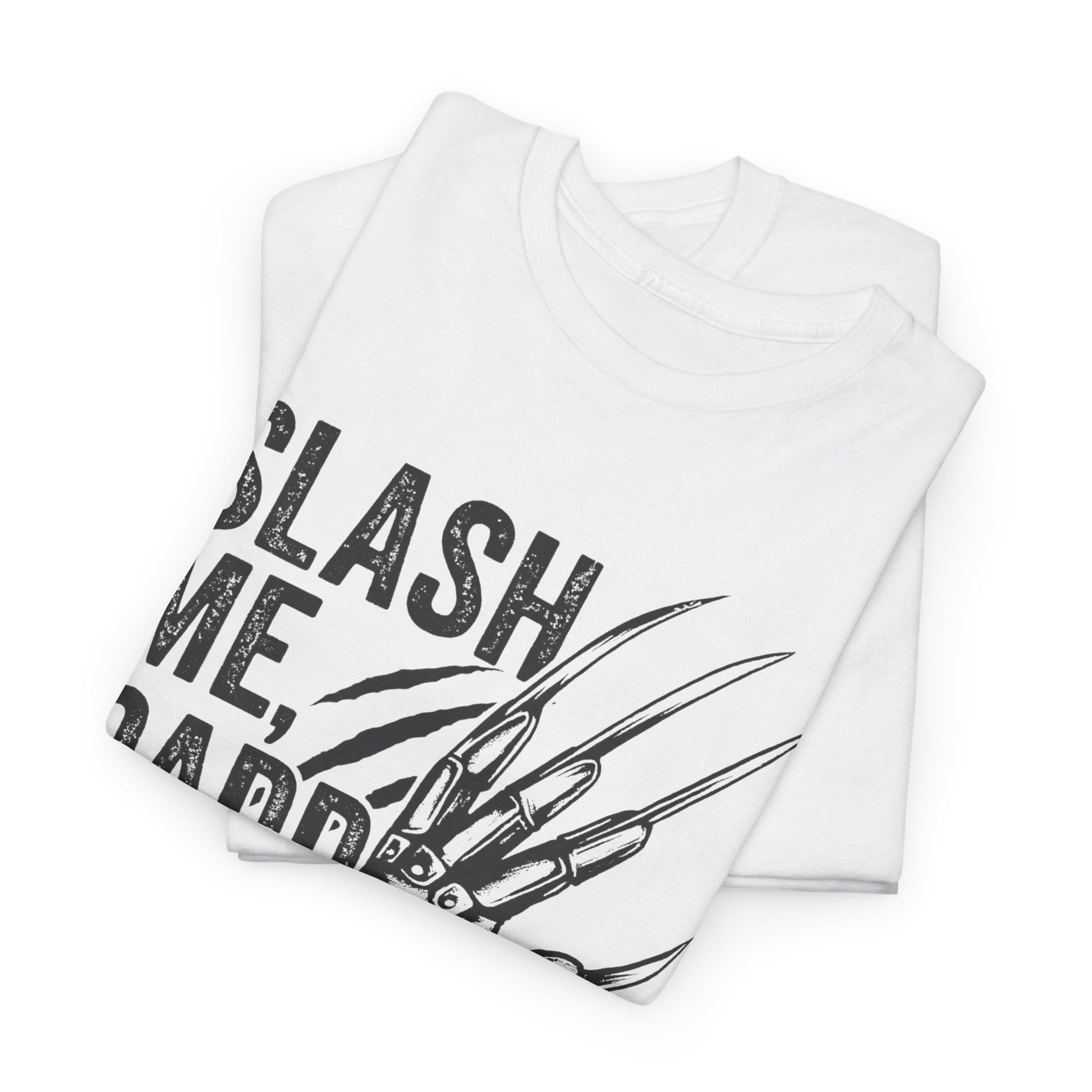 “Slash Me, Daddy” slices its way across your chest with bold, distressed lettering and a clawed glove that knows exactly where to leave its mark. It’s dark. It’s dangerous. It’s damn near wearable foreplay.